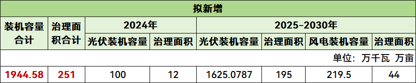 (四)2024年重点目标。2024年计划新增光伏装机容量100万千瓦,由新增项目实施主体开展12万亩沙化土地综合治理,其中在光伏场区内治理沙化土地面积3万亩,在光伏场区外的中和西镇和恩格贝镇(毛卜拉孔兑、布日嘎斯太孔兑和黑赖沟孔兑之间),划定9万亩退化林改造修复区用于沙化土地综合治理。