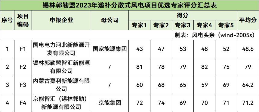根据《锡林郭勒盟2023年递补分散式风电项目优选专家评分汇总表》,申报企业分别为国电电力河北新能源开发有限公司、锡林郭勒盟智汇新能源有限公司、内蒙古嘉利新能源有限公司、京能智汇(锡林郭勒)新能源有限公司。