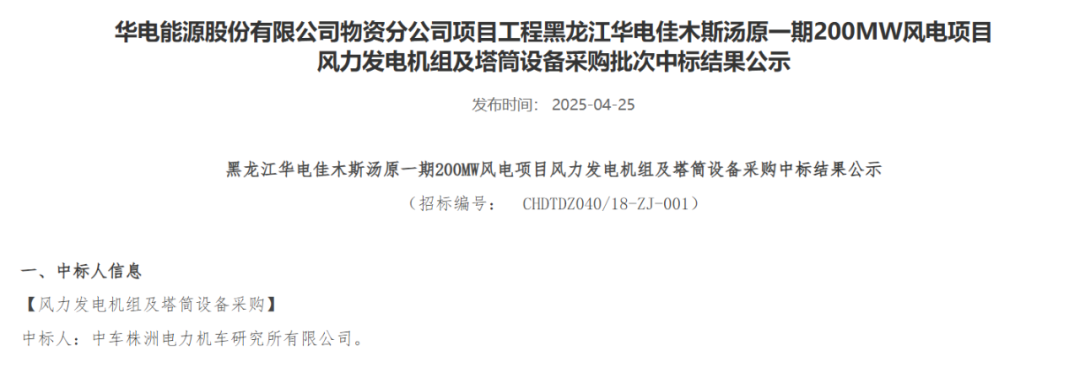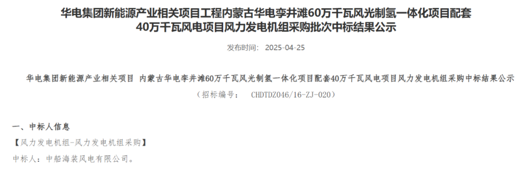 近日,华电集团电子商务平台发布重庆华电奉节高桥7.5万千瓦风电项目、黑龙江华电佳木斯汤原一期200MW风电项目、内蒙古华电孪井滩60万千瓦风光制氢一体化项目配套40万千瓦风电项目、云南华电红河开远大黑山扩建19.5万千瓦风电项目、黑龙江华电黑河北安建华20万千瓦风电项目、贵州华电松桃长兴、金海湖新区乌箐、安顺西秀岩腊、望谟郊纳风电项目31.25万千瓦、甘肃华电临夏州盐锅峡镇下铨村和通渭县孟河村、卢董村“千乡万村驭风行动”试点项目5万千瓦风力发电机组采购中标结果公示的公告。