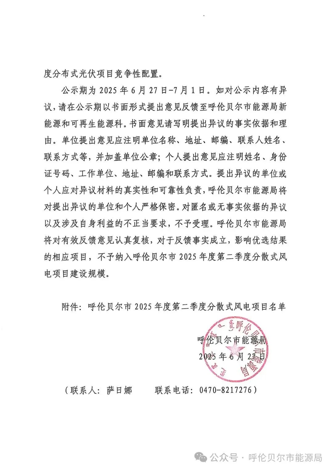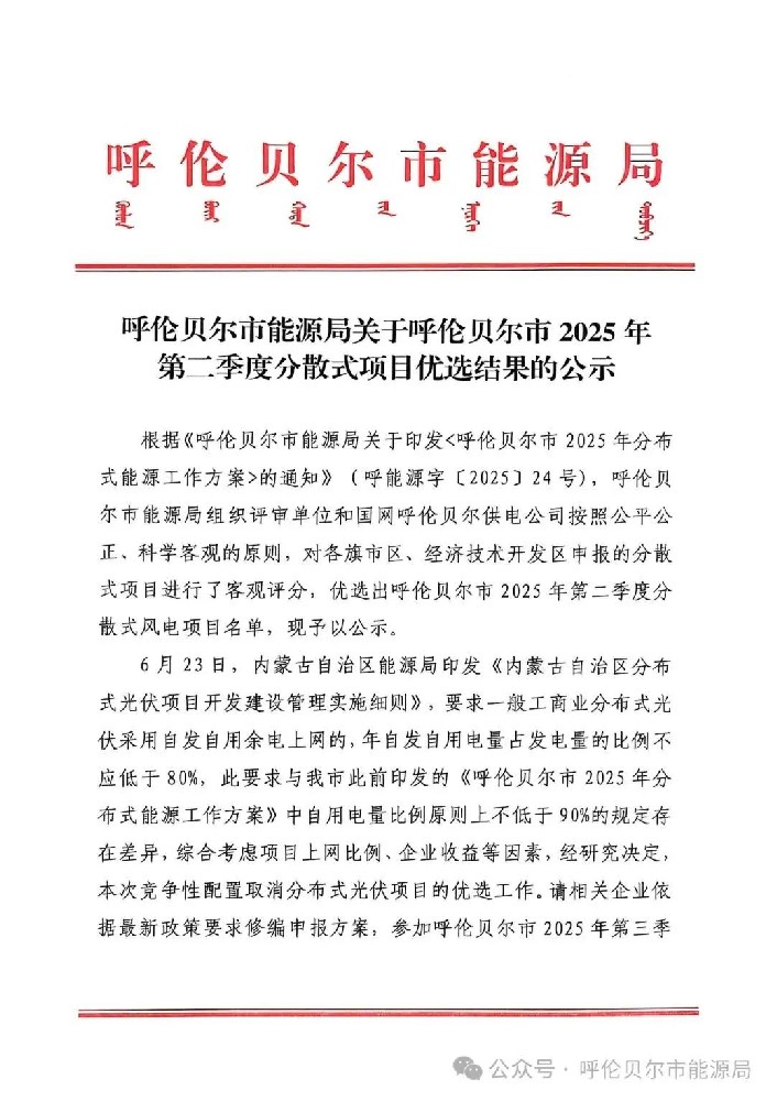 6月27日,内蒙古呼伦贝尔市能源局公示其2025年第二季度分散式项目优选结果。