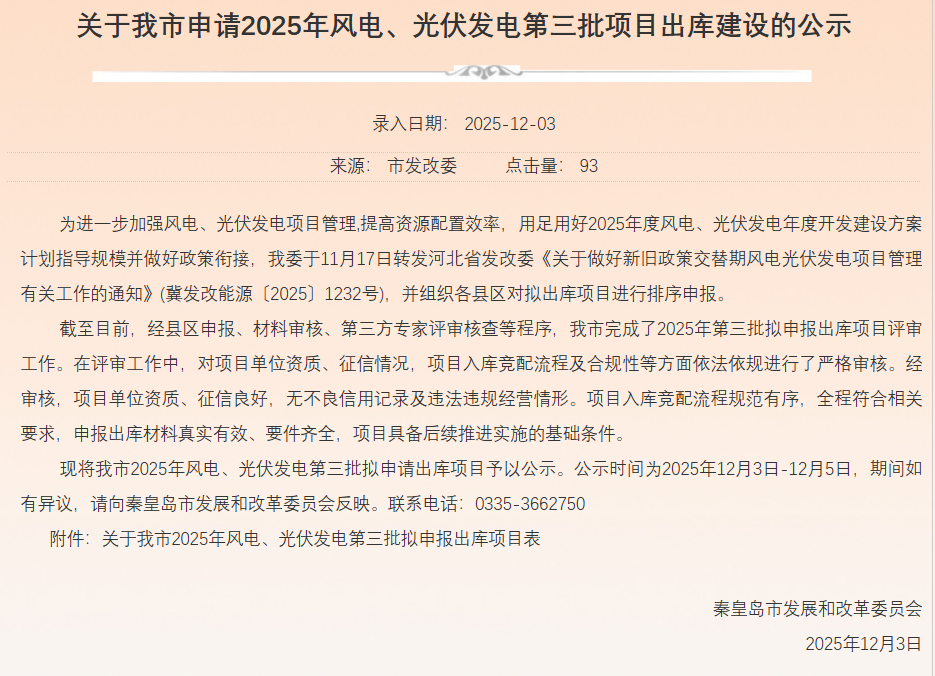 12月3日,河北秦皇岛市发改委发布《关于我市申请2025年风电、光伏发电第三批项目出库建设的公示》。