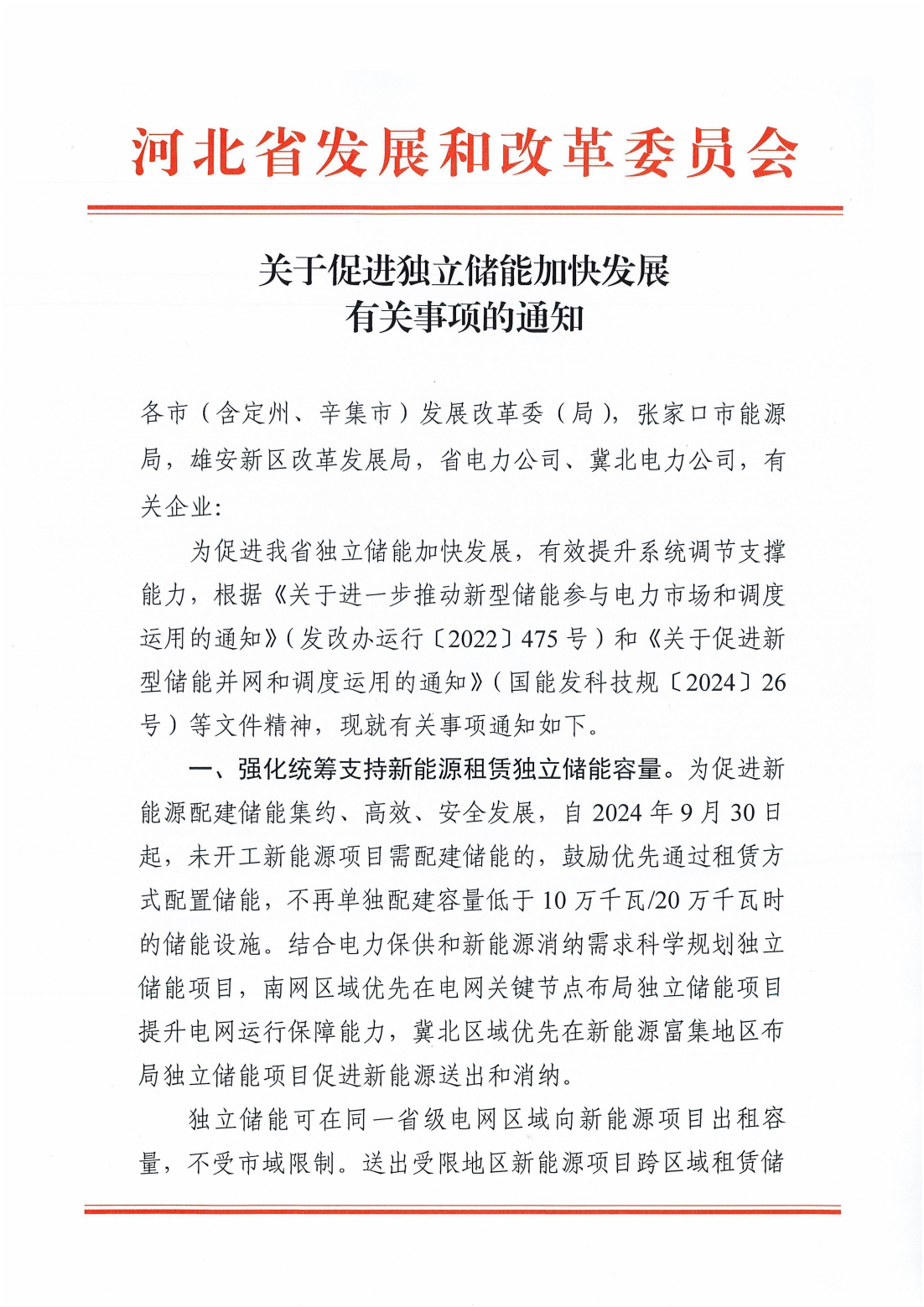 河北:支持储能容量租赁 不再单独配建100MW/200MWh以下储能设施
